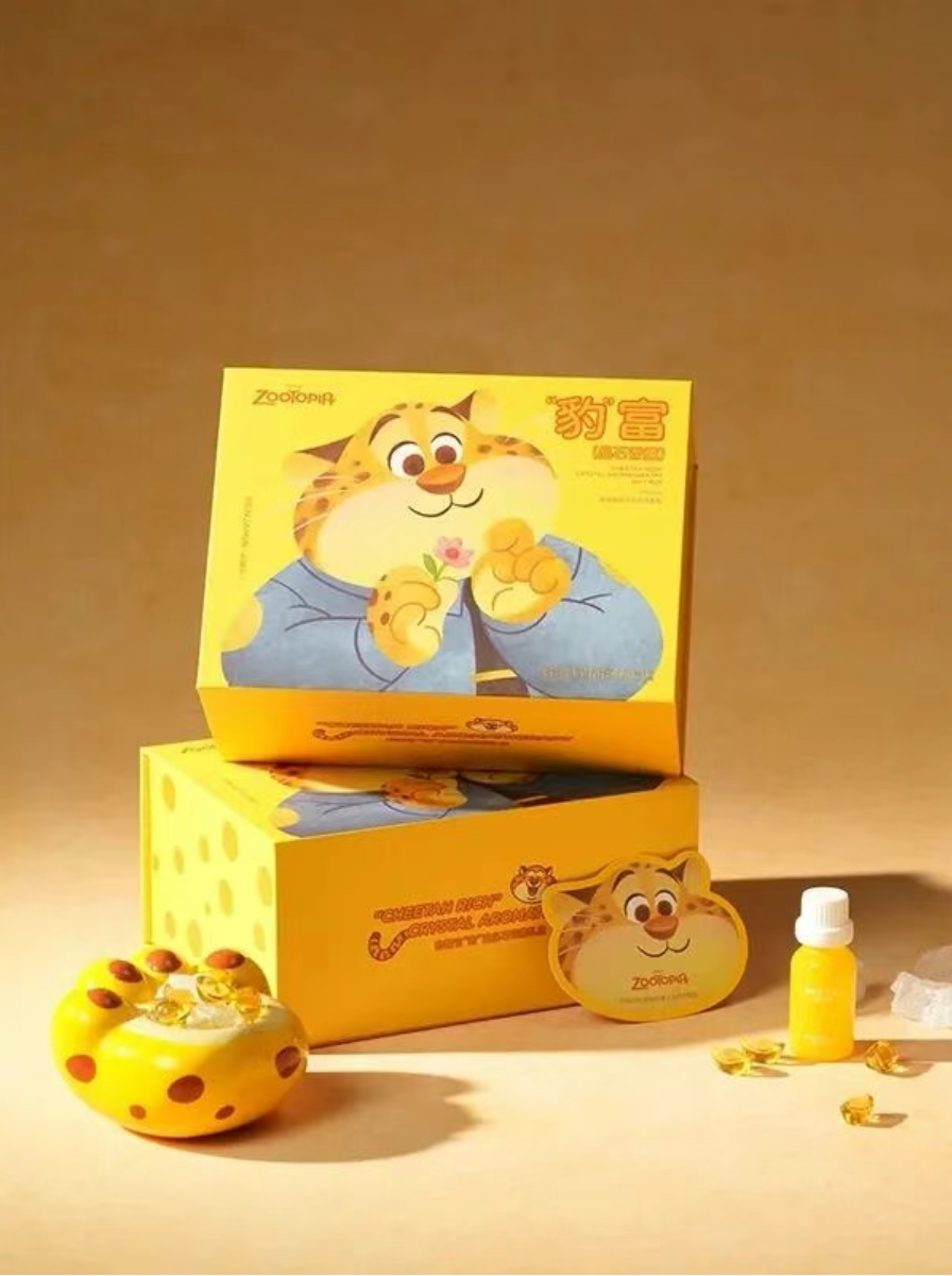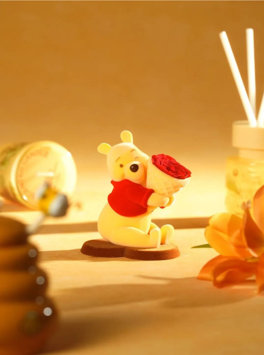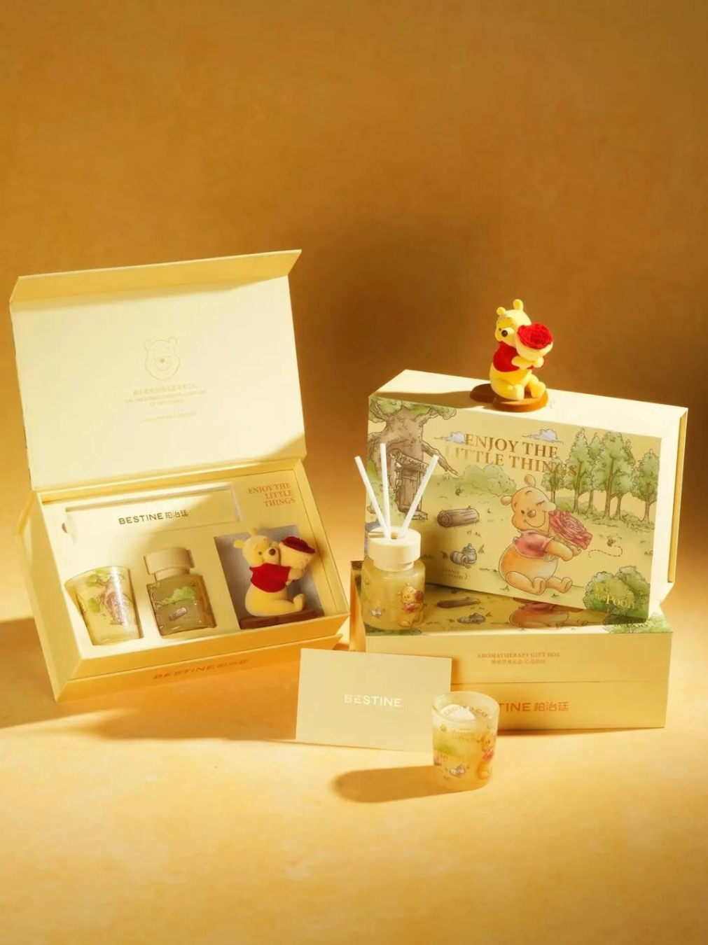 米奇主题香薰礼盒,产品则将米奇标志性的红色短裤转化为香薰瓶身,并使用米奇标志性的白色四指手套作为扩香条,强化角色辨识度,也让香氛散发过程更具戏剧化与互动感。手部造型与瓶身(裤子)形成角色完整度,仿佛米奇“藏”在瓶中伸出手来,营造出萌趣生动的视觉故事。
