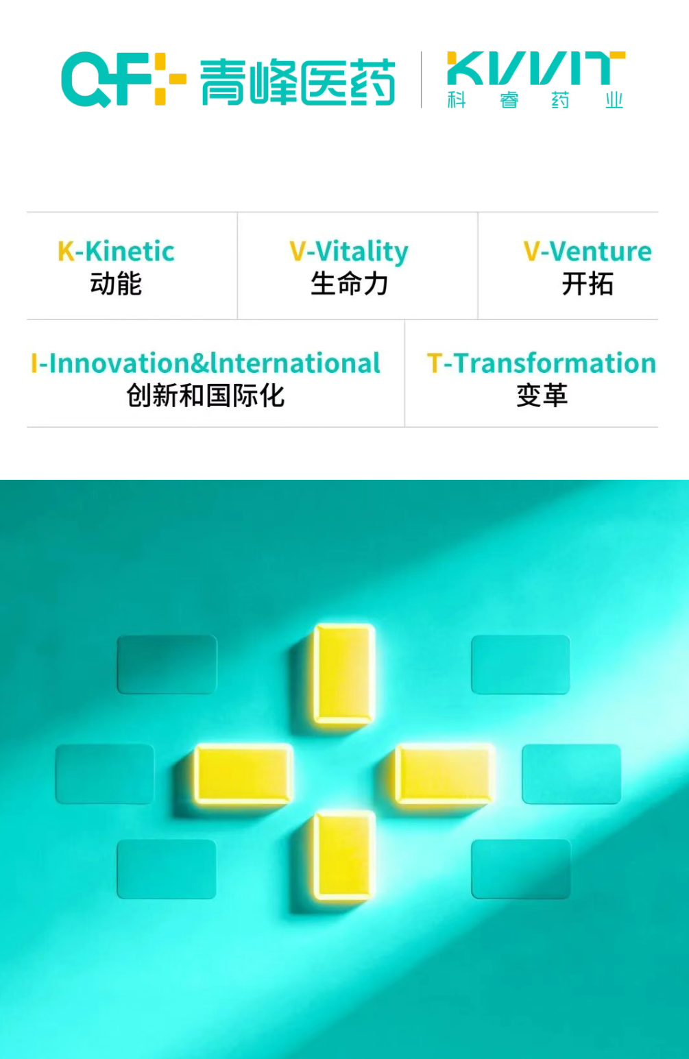 集团形象升级后,Thanger(三格创意)也为青峰医药化药业务板块旗下的科睿药业(KVVIT)完成了品牌标识设计。标识以「KVVIT」为核心视觉符号,其中「vit」词根源自拉丁语「vita」(意为「生命」),与医药行业属性深度契合,创意设计与色彩基因一脉相承,继承集团品牌核心风格,深度强化了子母品牌的一体化认知。