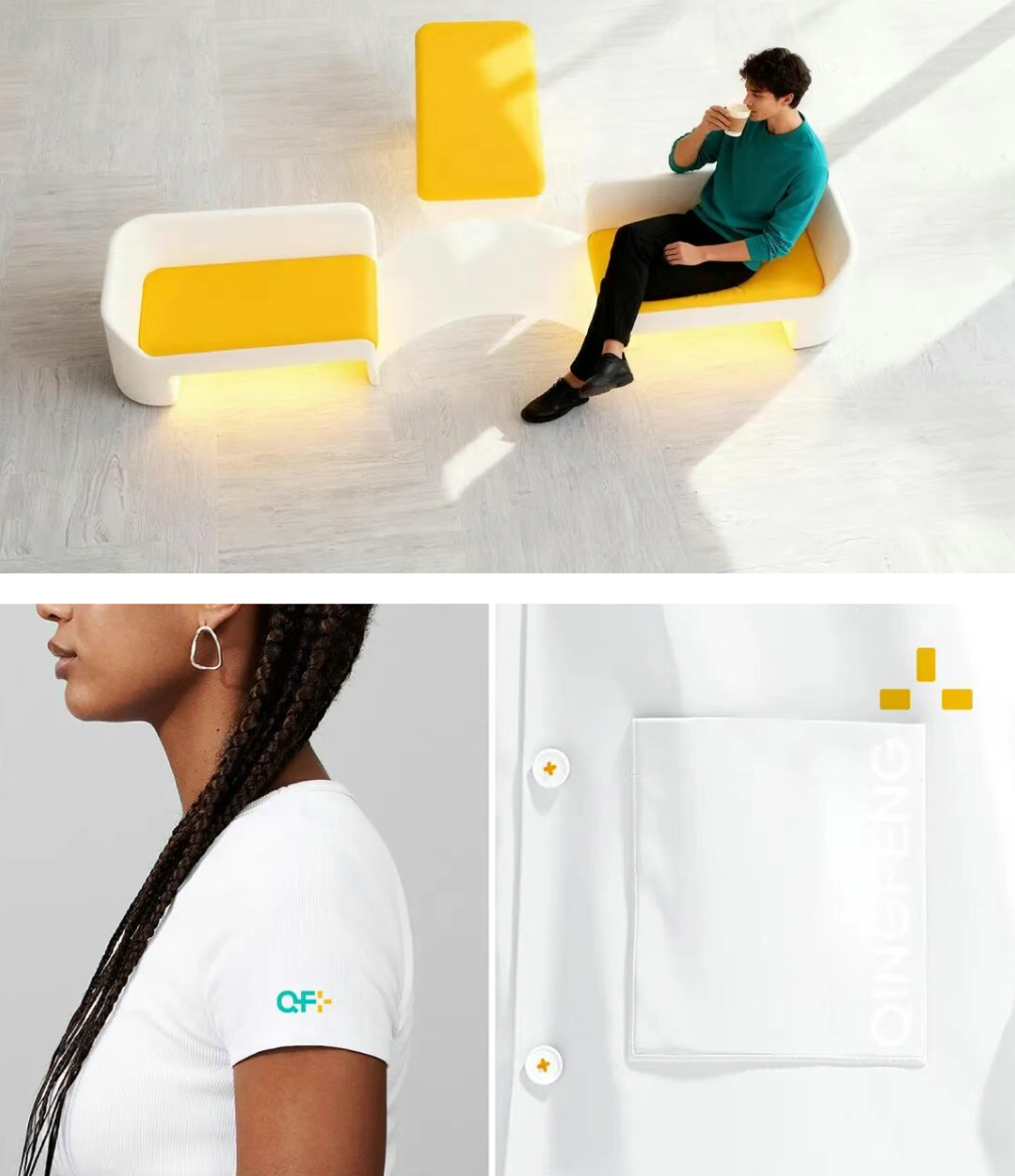 这一色彩选择在强化品牌辨识度的同时,也体现出深厚的文化意涵。设计一方面紧扣「青峰」这一品牌名称,另一方面借由「青」在中国文化中的多重象征意义展开联想,从青梅竹马的纯真情感,到平步青云的进取理想,再到千里江山的恢弘气象与炉火纯青的专业境界,逐步构建起丰富而立体的文化共鸣。再结合象征阳光与希望的「阳光金」,最终形成「医学青 + 阳光金」的专属色彩体系,传达出「生命、科技、人文」相互融合的品牌价值观。