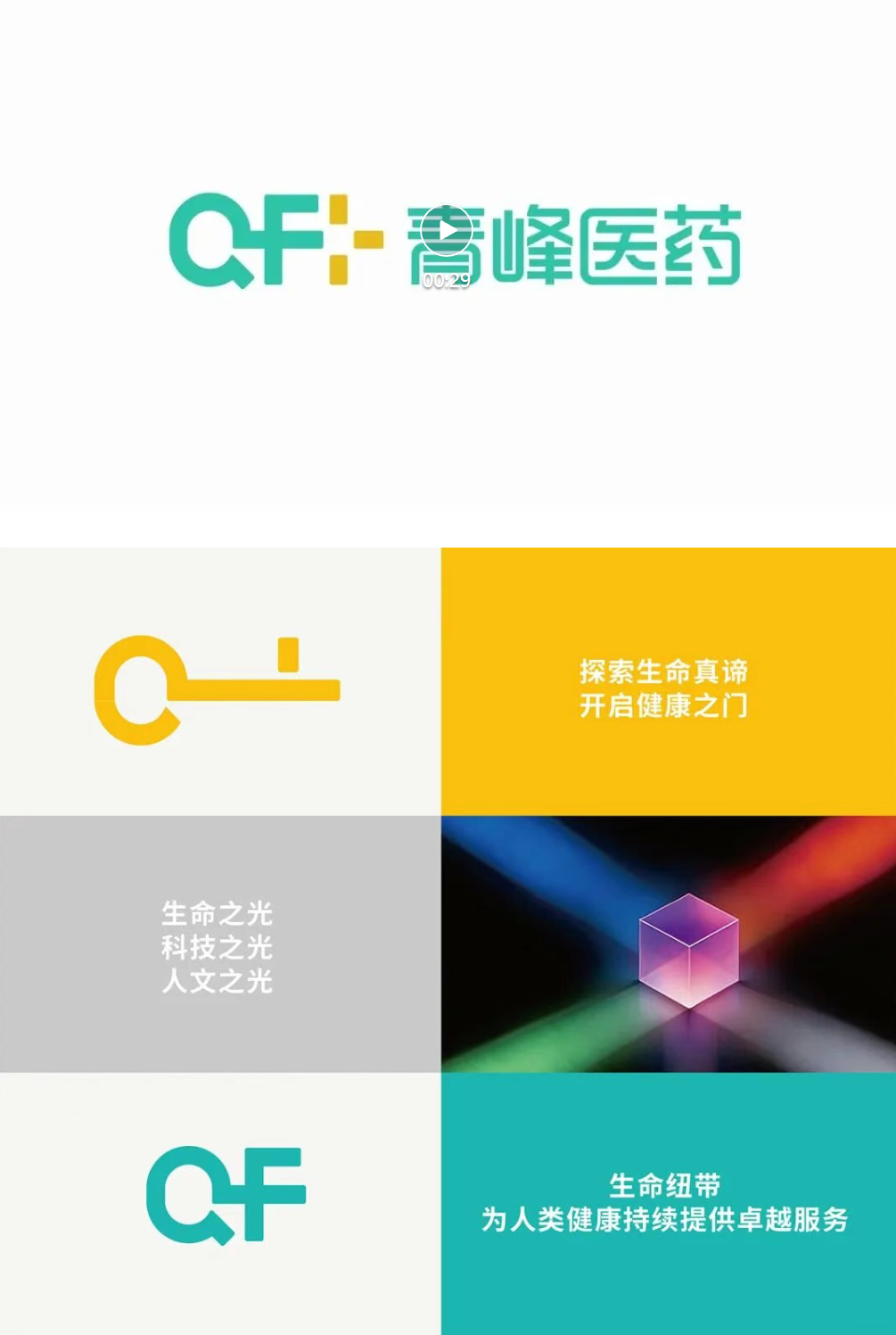新标识由「青峰」二字拼音首字母「Q、F」组成,形态是一把坚定沉稳,但始终绽放创新光芒的钥匙,寓意着青峰致力探索生命真谛,开启健康之门,提供精准且卓越的生命健康服务。