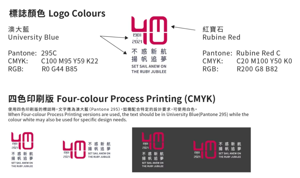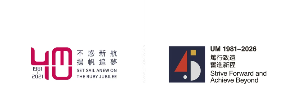 另外补充说明下五年前的四十周年校庆标志设计理念:标志以大学的缩写「UM」与数字「40」巧妙地融为一体,辅以1981-2021创校40年的年份。40周年为红宝石禧年,主色采用红宝石颜色。40周年的标语「不惑新航,扬帆追梦」象征大学踏入40不惑之年,处于一个承前启后,继往开来的新发展阶段。在历史带来的新发展机遇之下,大学锐意进取,以创新思维迎接新的挑战,致力达成卓越大学的梦想,缔造新的成就!