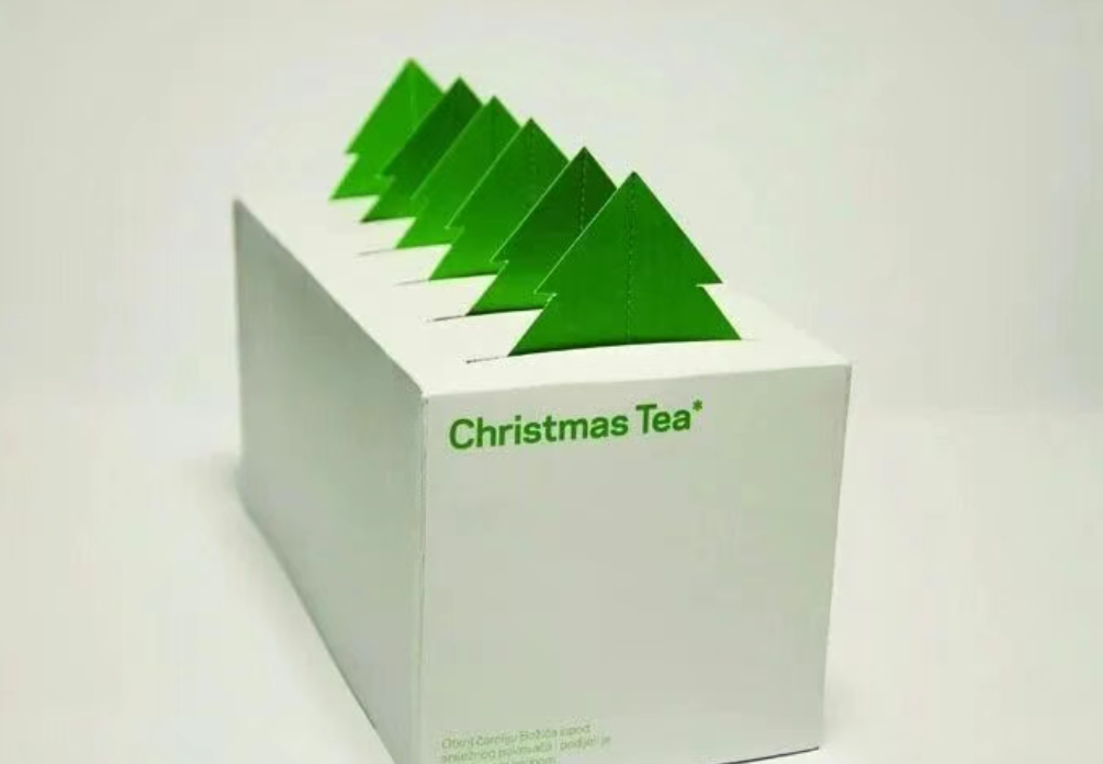 设计以绿色的圣诞树造型为主要视觉符号,茶包巧妙的塑造成可以折叠撕开的圣诞树形态,直观体现出浓郁的圣诞节日氛围。而多棵圣诞树有序排列的结构,既丰富了整体观感,同时也强化了“团聚与分享”的主题暗示,让用户在打开包装的瞬间便已呼之欲出。