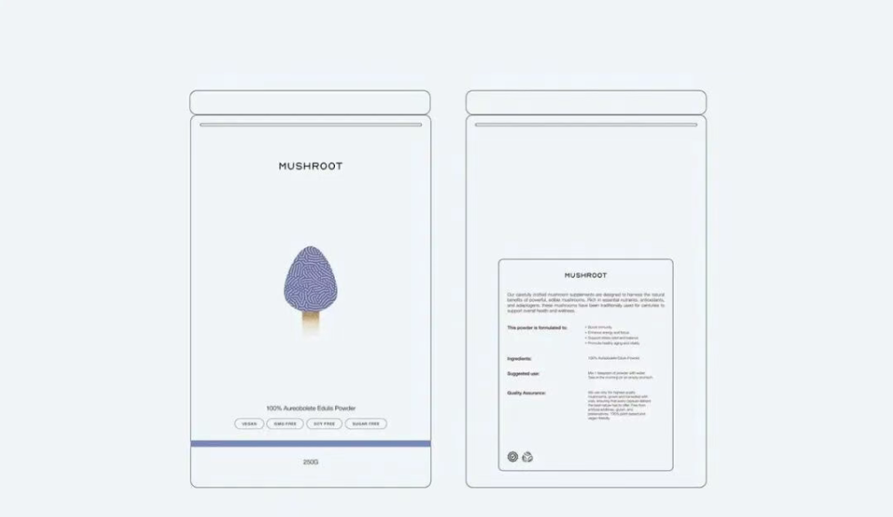 Mushroot 蘑菇营养补充剂,以现代极简的设计语言,将药用蘑菇的天然疗愈力转译到包装上。不堆砌、不浮夸,让 “纯净、专业、自然” 成为第一眼就能感知的品牌气质,精准贴合健康消费群体的审美偏好,传递 “源于自然、忠于功效” 的核心价值。