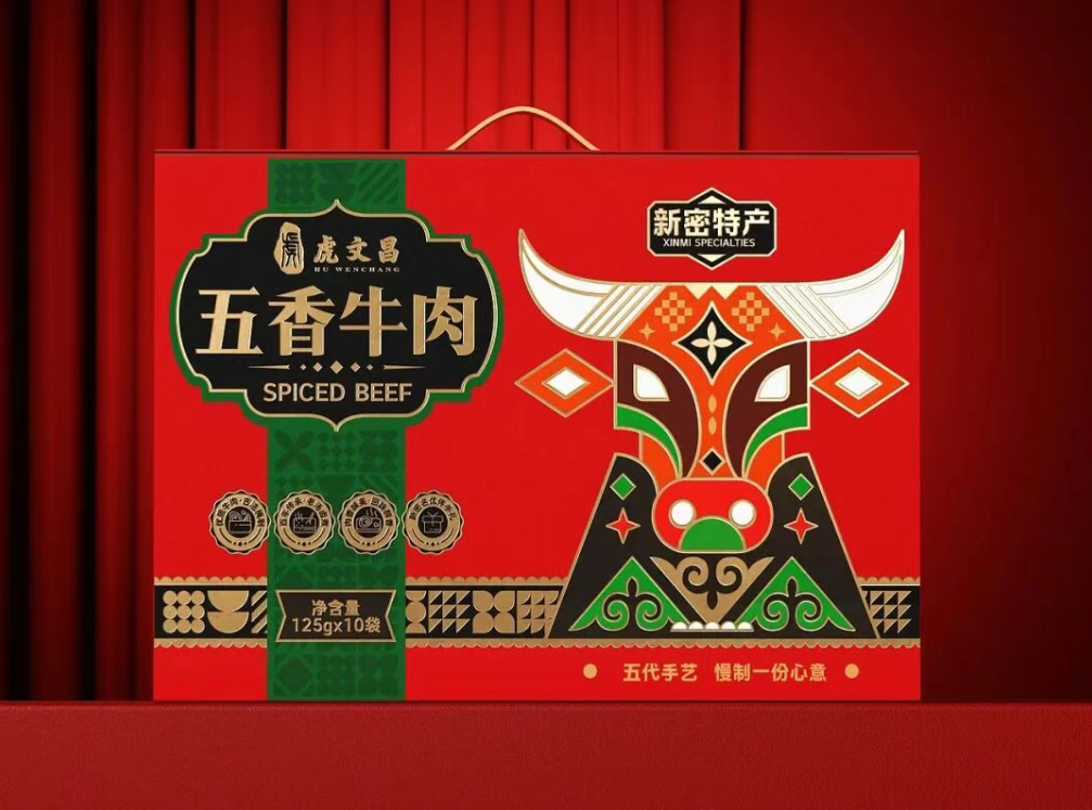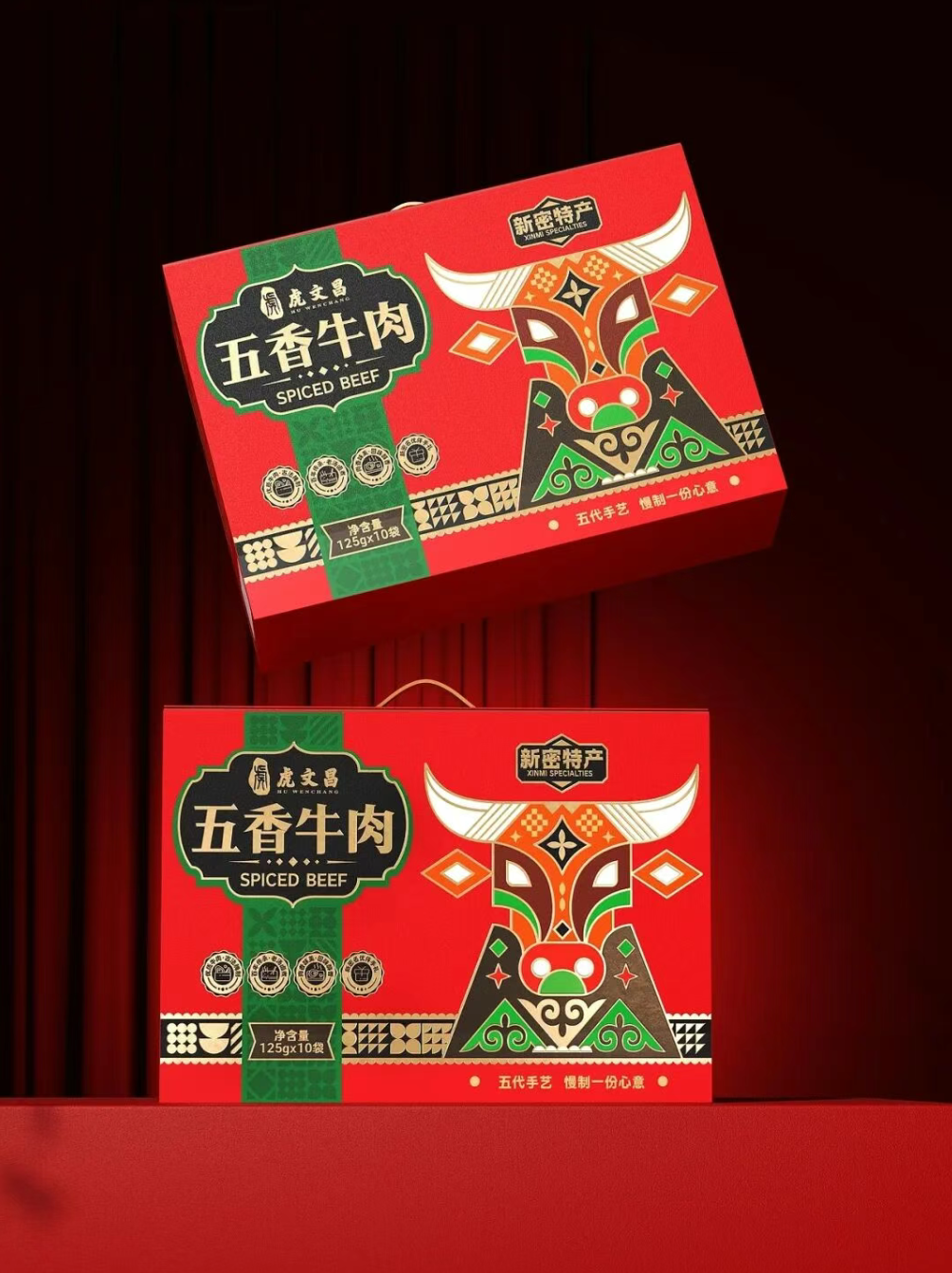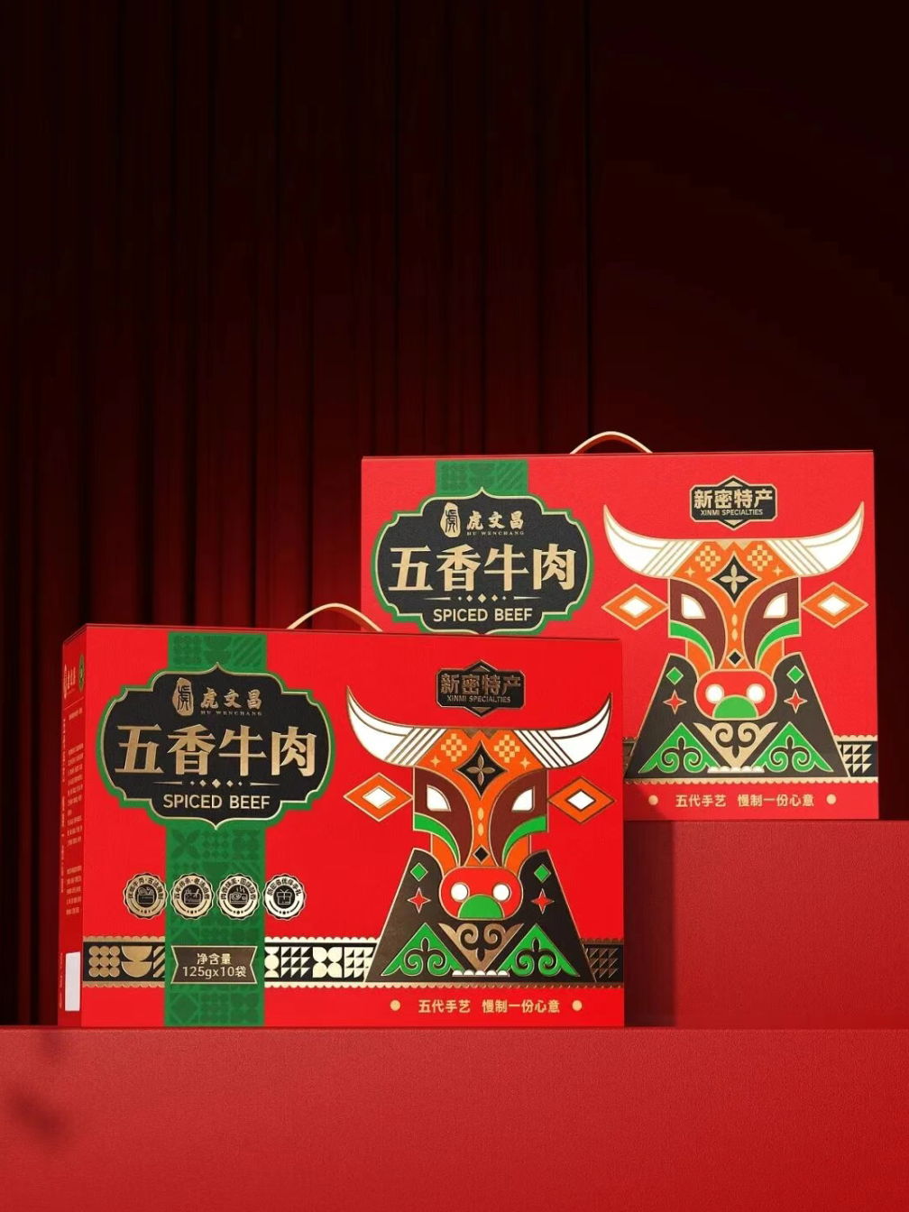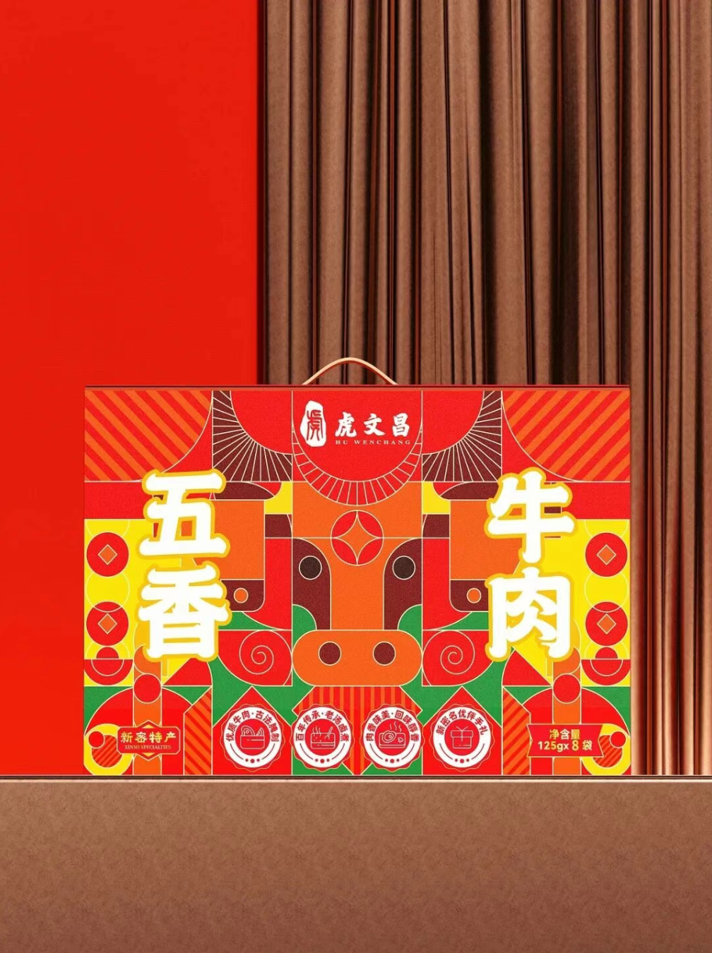第一款礼盒视觉上用大面积正红奠定节庆基调,搭配墨绿和烫金做撞色呈现,打破传统特产礼盒风格。主视觉方面,核心的视觉符号是抽象化的牛头图腾,将传统青铜器纹样与几何拼接手法结合,保留了“牛”的产品属性,又通过年轻化的设计语言平衡了老字号的厚重感,让传统卤味的“匠心”有了可视化的表达。