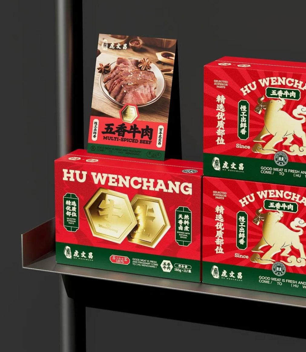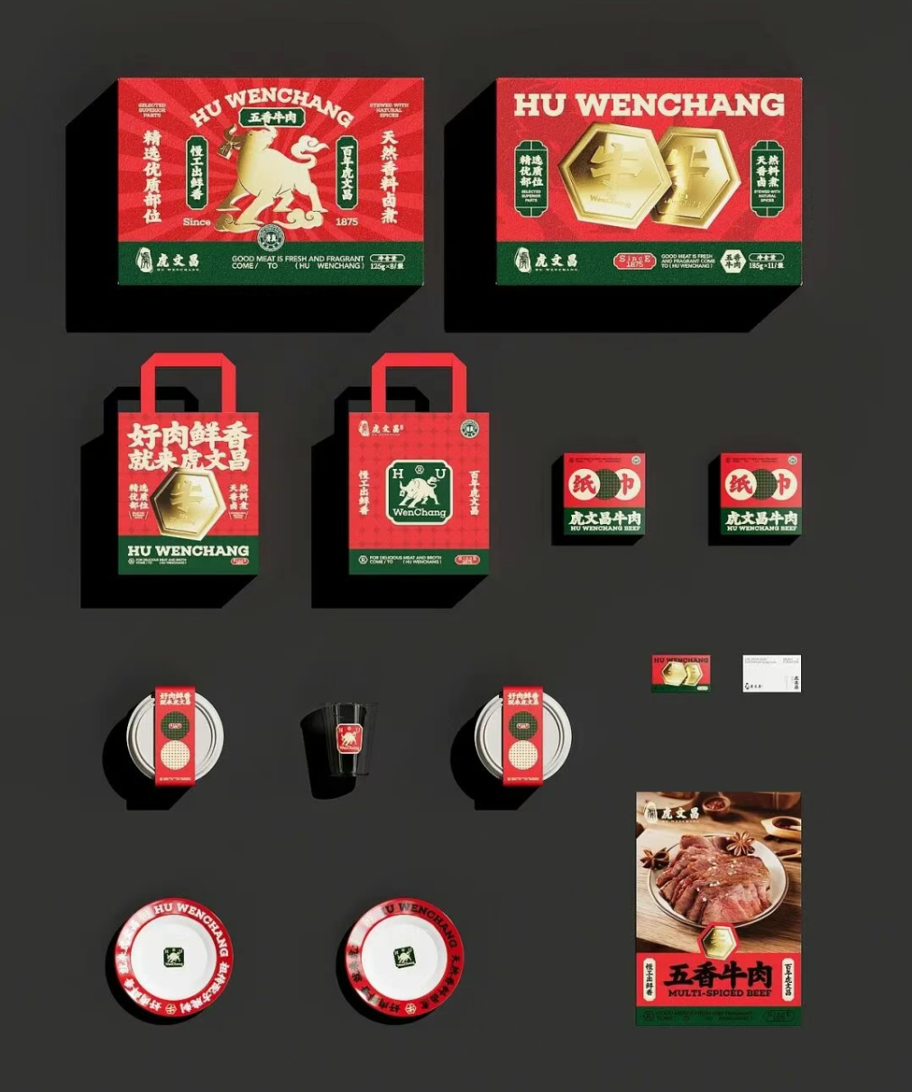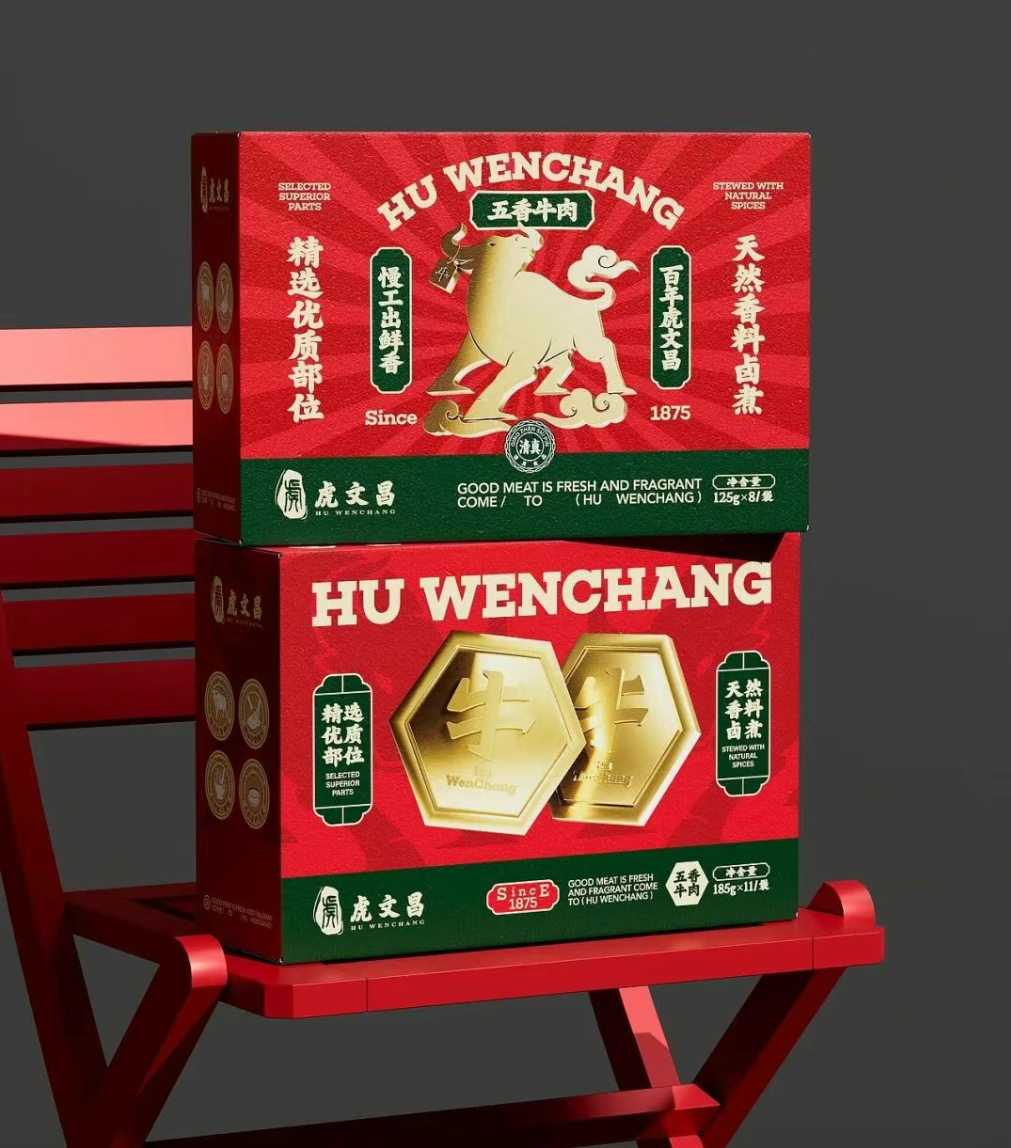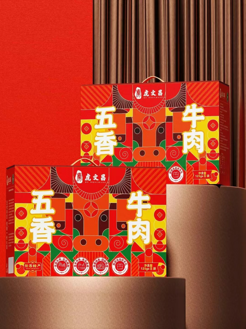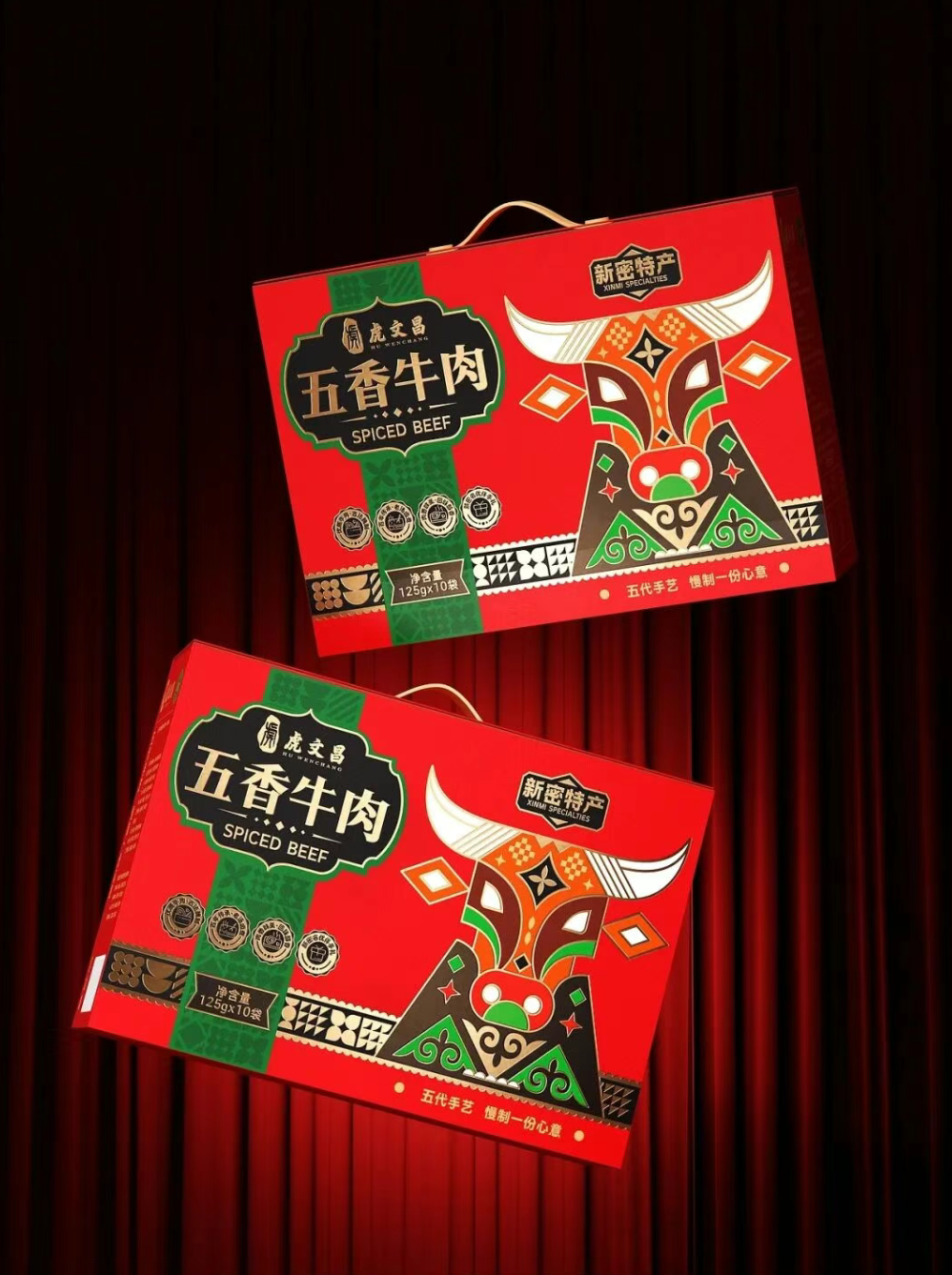 第一款礼盒视觉上用大面积正红奠定节庆基调,搭配墨绿和烫金做撞色呈现,打破传统特产礼盒风格。主视觉方面,核心的视觉符号是抽象化的牛头图腾,将传统青铜器纹样与几何拼接手法结合,保留了“牛”的产品属性,又通过年轻化的设计语言平衡了老字号的厚重感,让传统卤味的“匠心”有了可视化的表达。