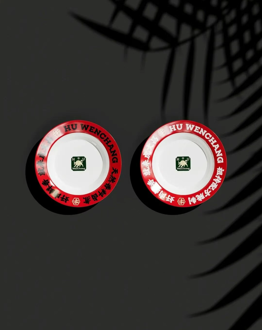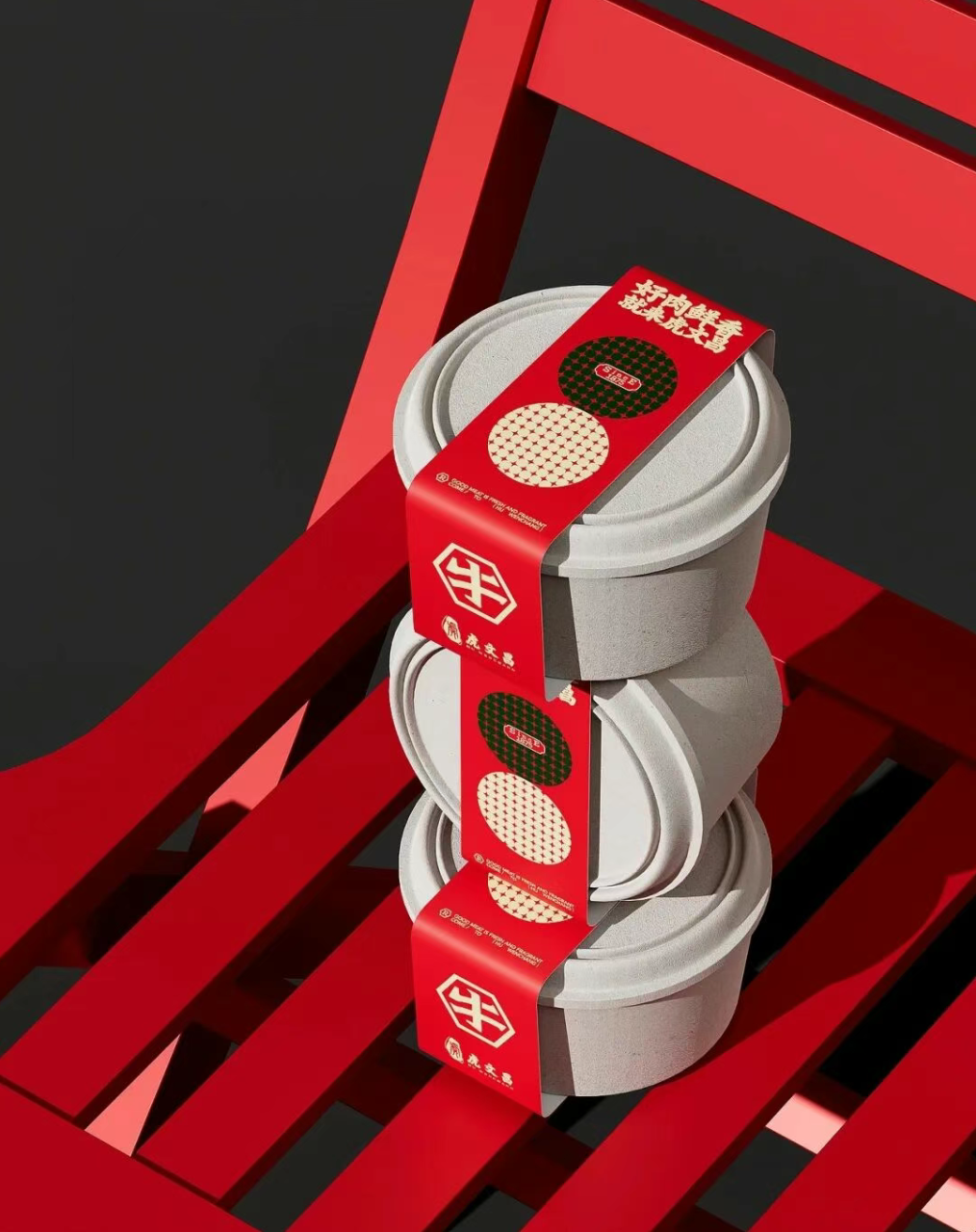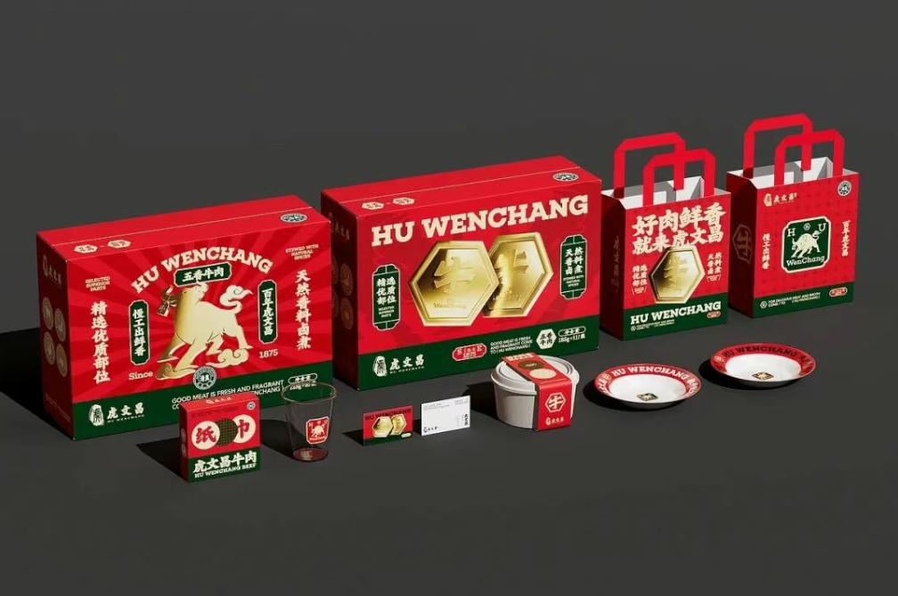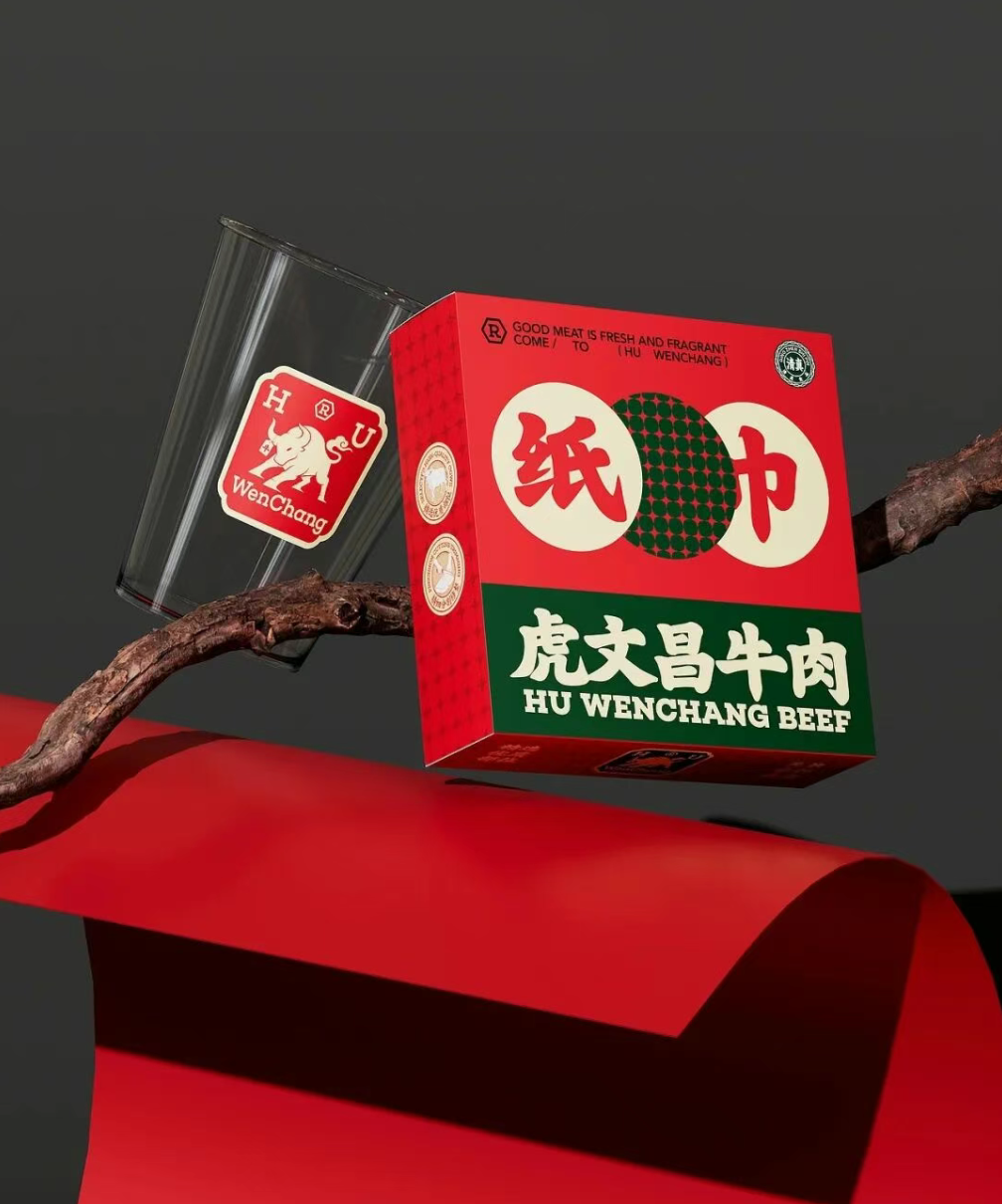 第一款礼盒视觉上用大面积正红奠定节庆基调,搭配墨绿和烫金做撞色呈现,打破传统特产礼盒风格。主视觉方面,核心的视觉符号是抽象化的牛头图腾,将传统青铜器纹样与几何拼接手法结合,保留了“牛”的产品属性,又通过年轻化的设计语言平衡了老字号的厚重感,让传统卤味的“匠心”有了可视化的表达。