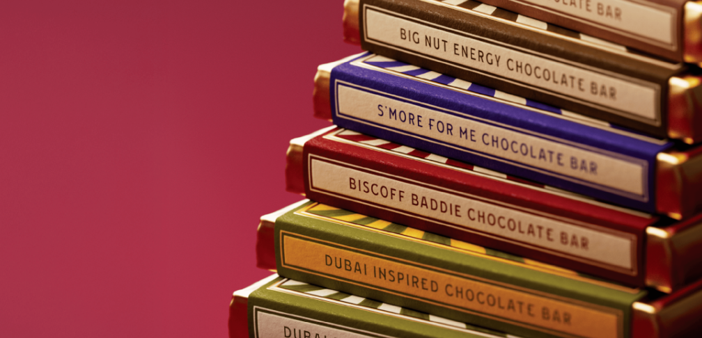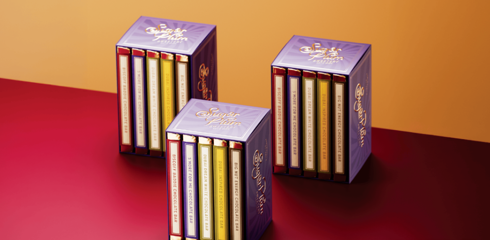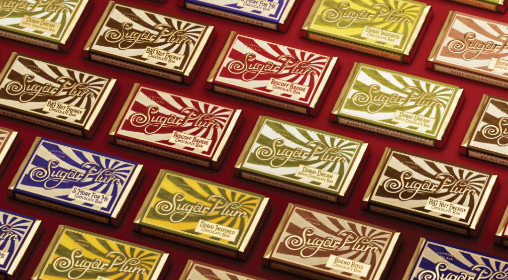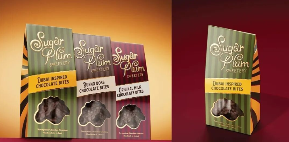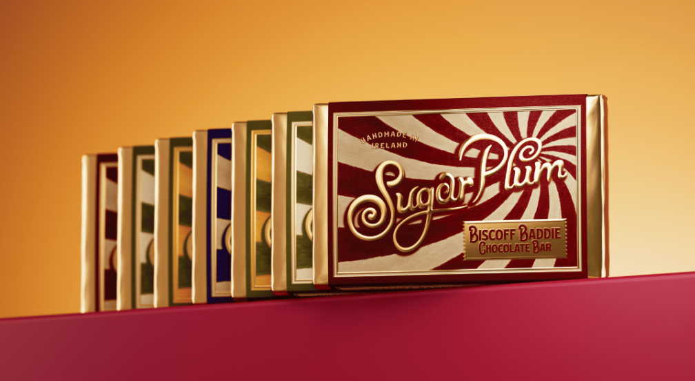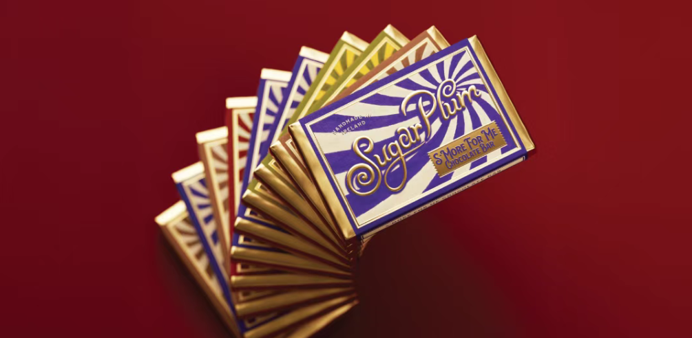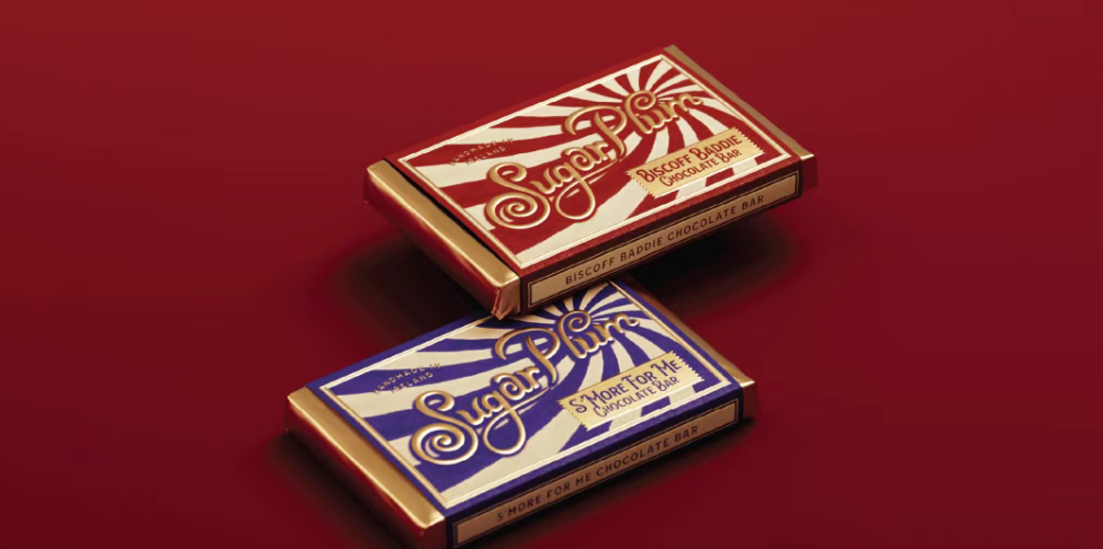 Sugar Plum巧克力以老式糖果包装的条纹为原型,用高饱和撞色(红白、绿白、黄绿)还原复古糖果店的视觉冲击力,条纹的放射感像阳光透过糖罐的光斑,传递 “新鲜出炉、充满活力” 的手工温度。