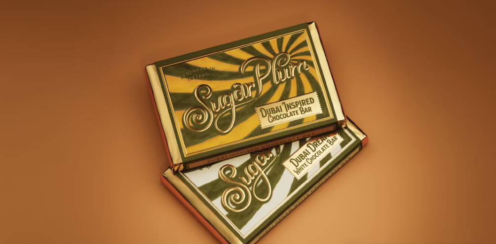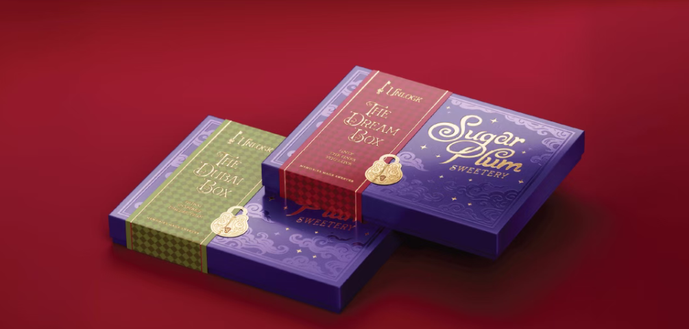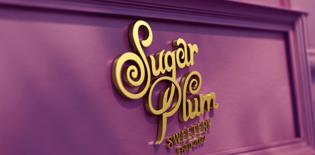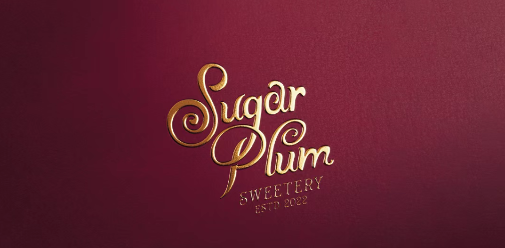 品牌名 “Sugar Plum” 采用圆润卷曲的鎏金手写体,字母线条的弧度像融化的巧克力,又像糖果的糖霜纹路,自带 “软糯、甜蜜” 的触感联想,同时鎏金质感提升了高端属性,让复古感不廉价、精致感不冰冷。