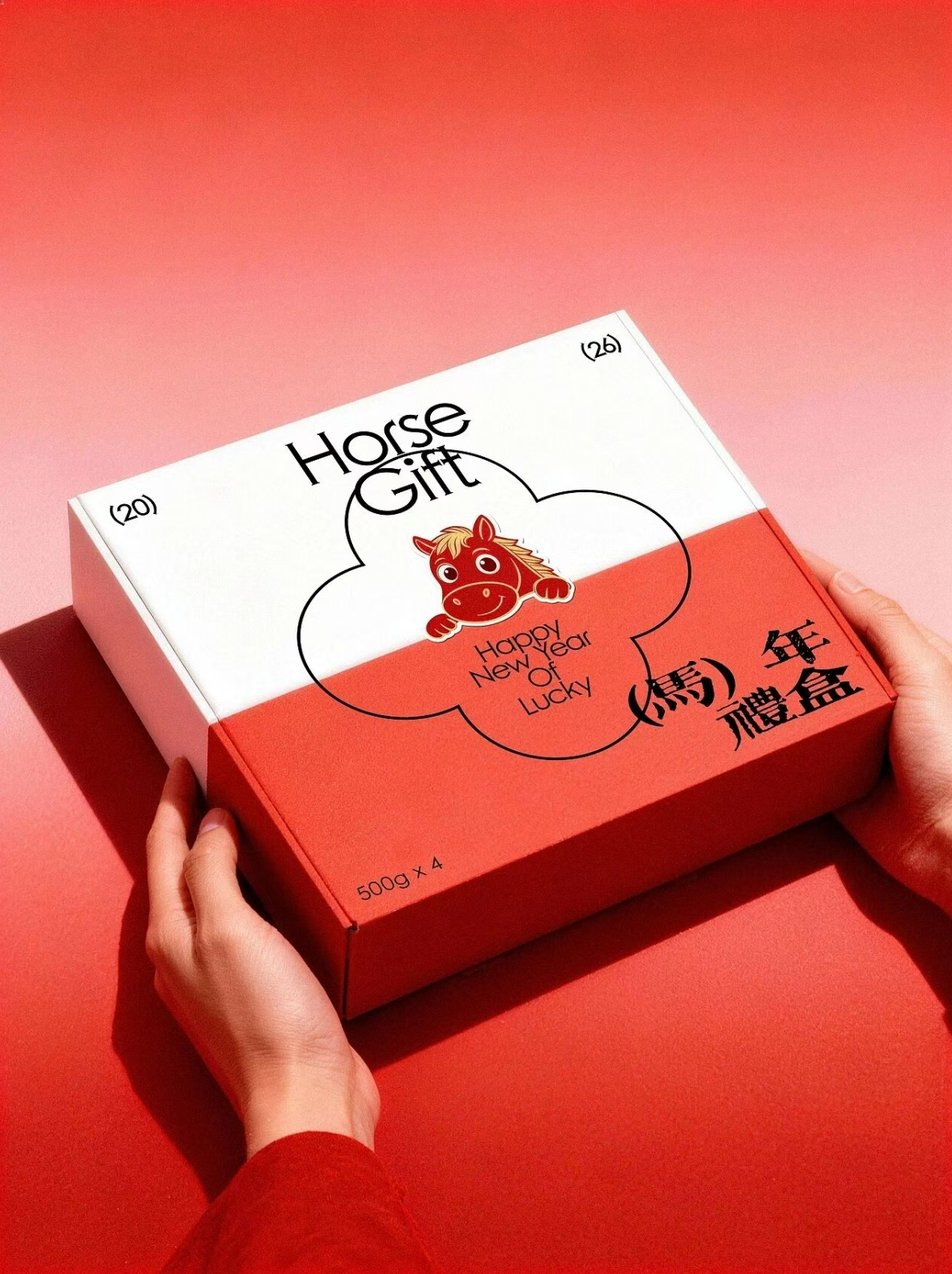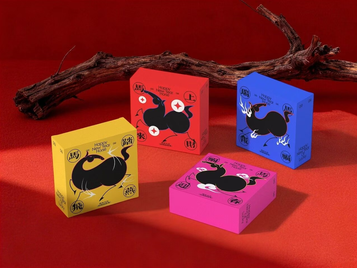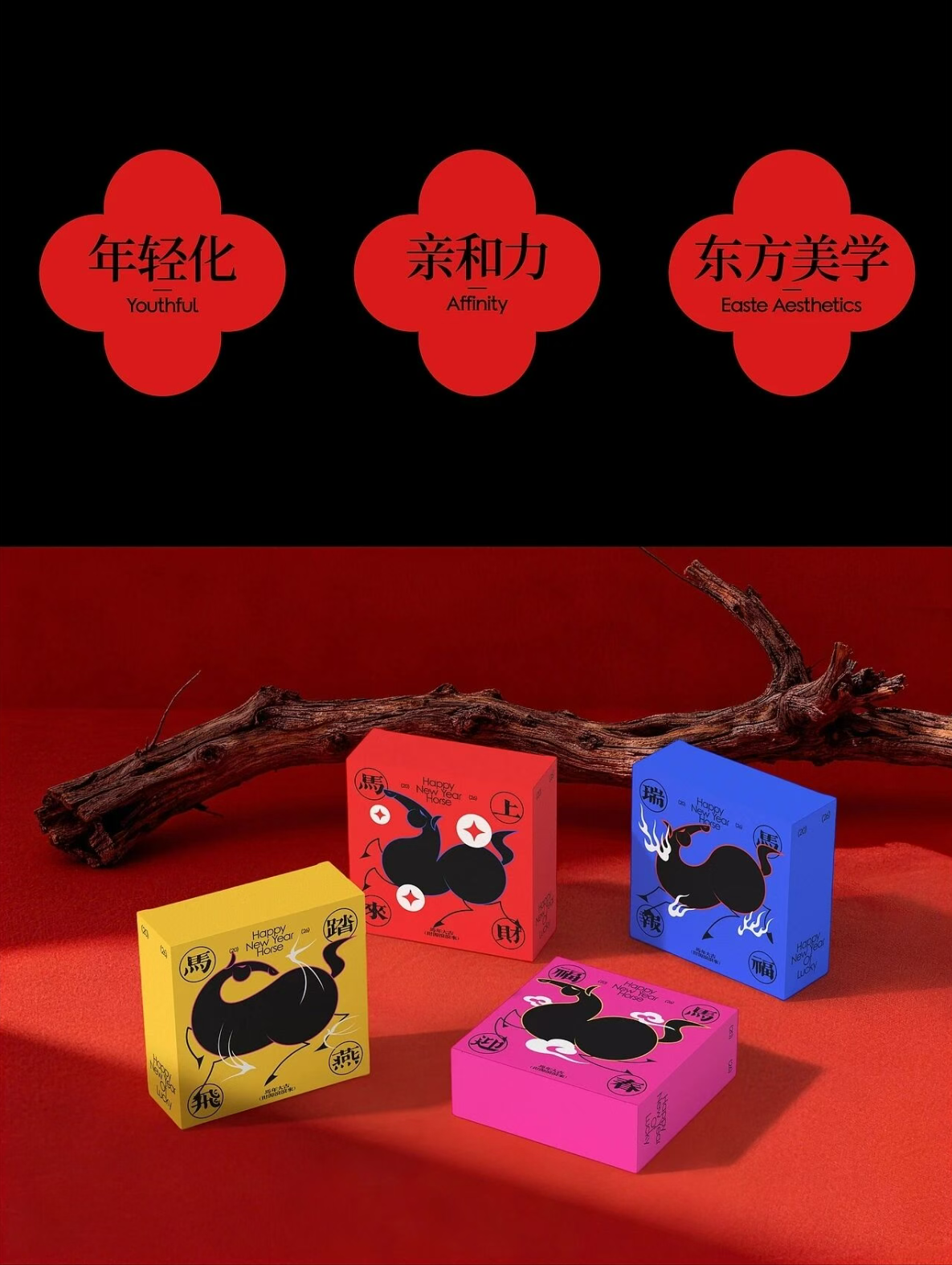 整体设计紧扣 “年轻化、亲和力、东方美学” 三大核心,视觉上既保留了东方文化的底蕴,又用潮流化的表达拉近了与年轻群体的距离。主礼盒采用红白撞色搭配简约线条,卡通小马头像与英文字样的组合弱化了传统年味的厚重感,增添了俏皮的亲和力;内部分装的四色小礼盒堪称点睛之笔,明黄、正红、宝蓝、玫粉的高饱和度色彩碰撞极具视觉冲击力,打破了春节礼盒单一的红色系审美。