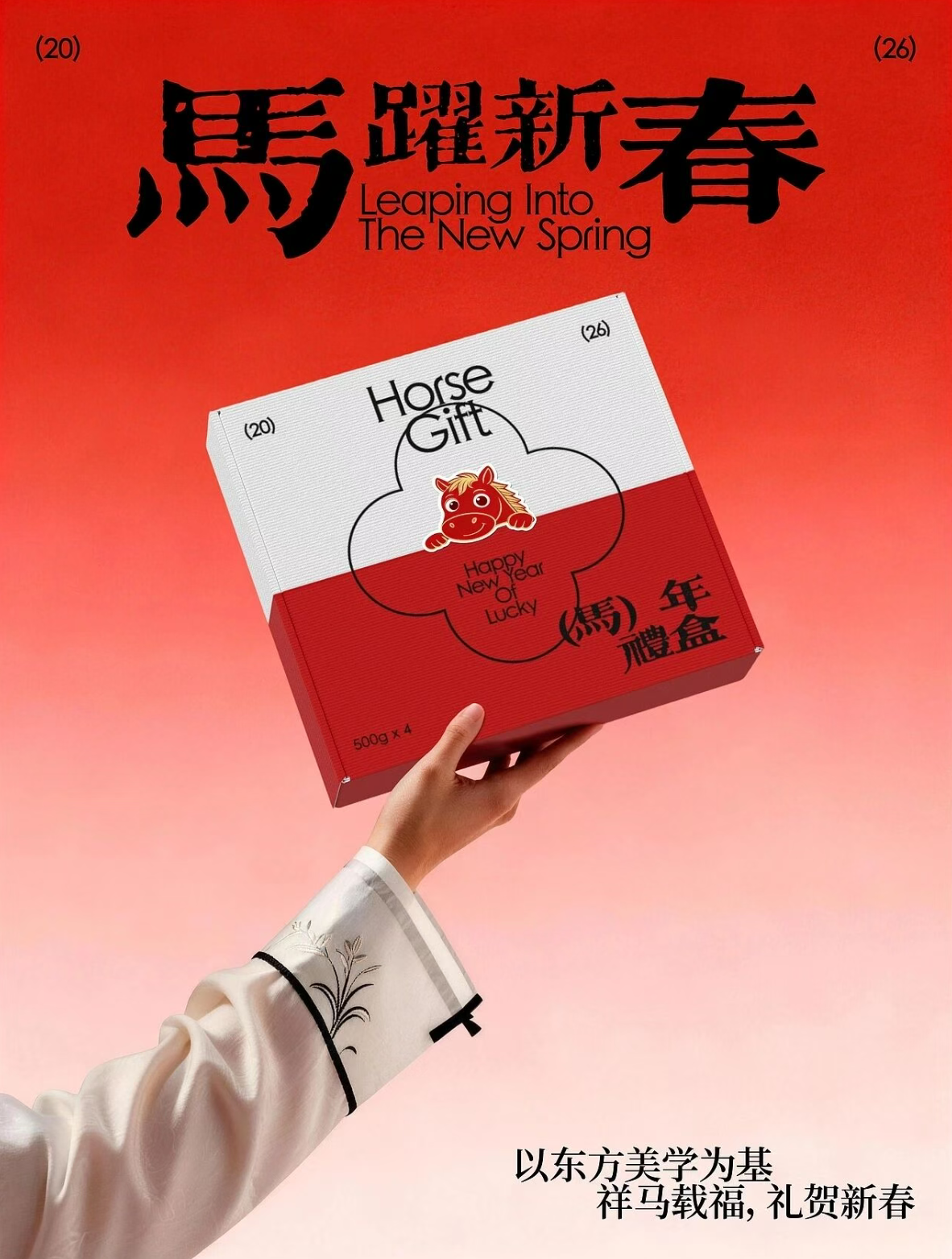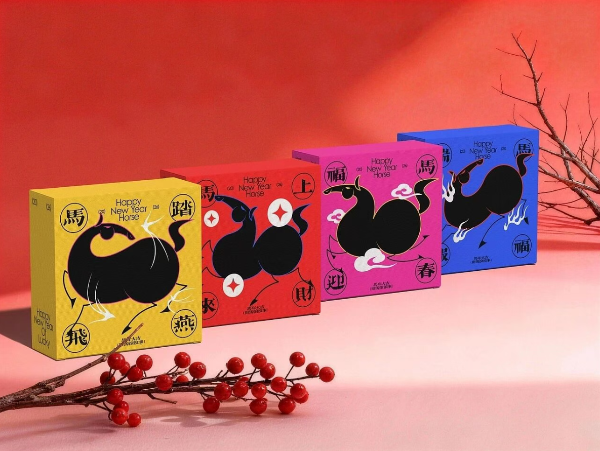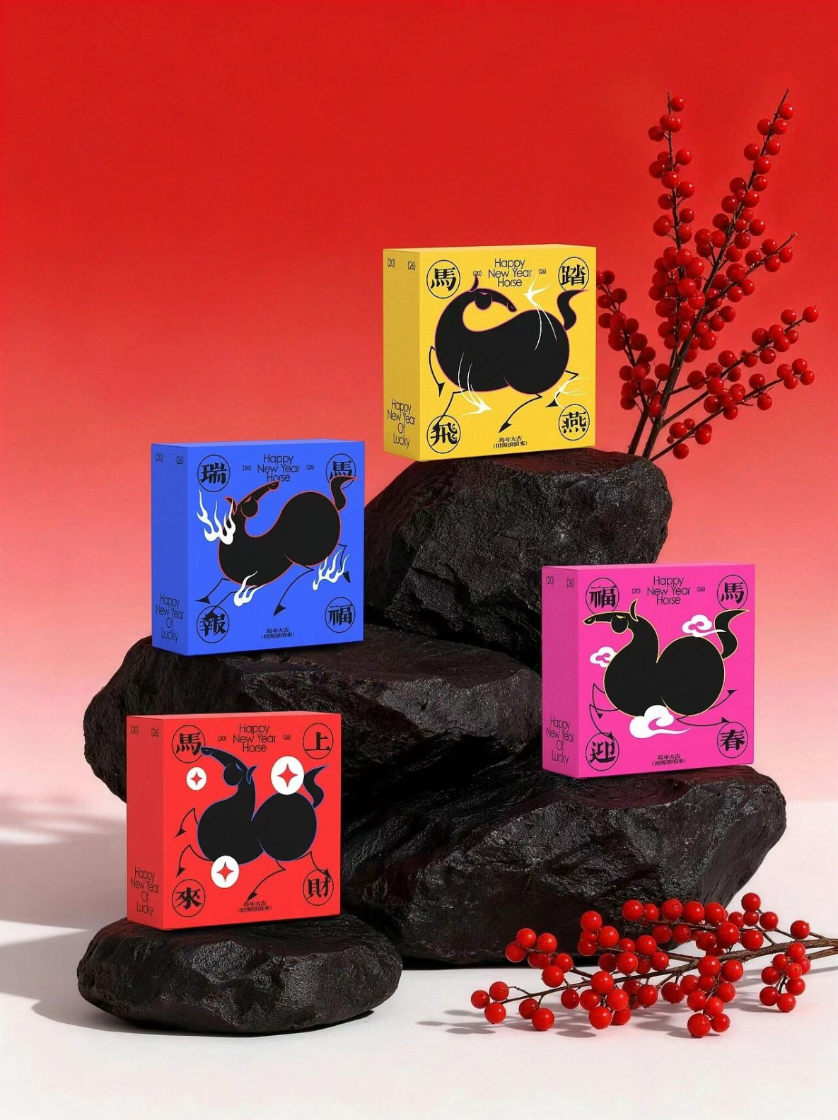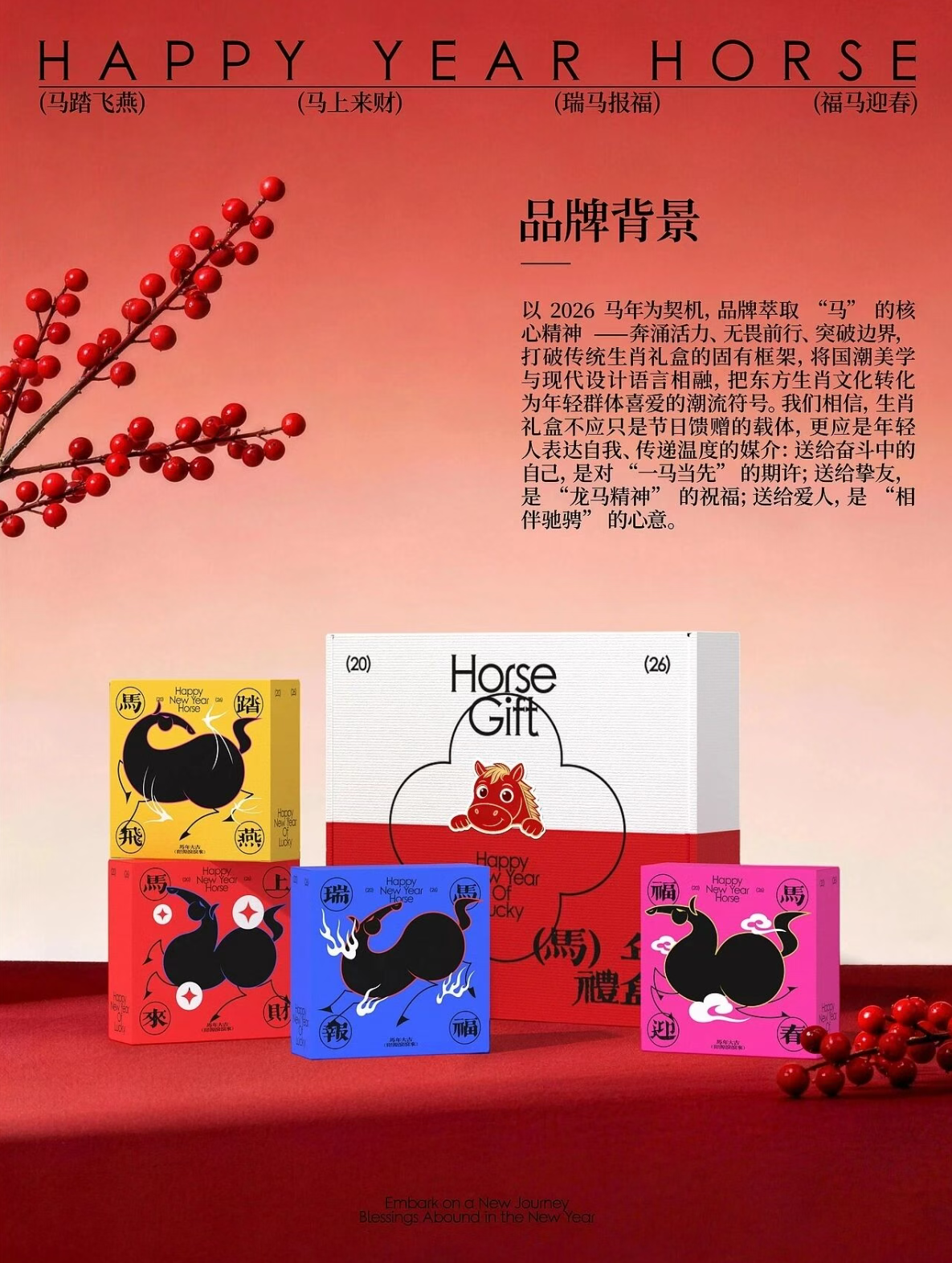 每款小礼盒上的抽象黑马图案以夸张的动态线条诠释 “马” 的奔涌活力与突破边界的精神,同时巧妙融入 “马踏飞燕”“马上来财”“瑞马报福”“福马迎春” 的吉祥寓意,让传统祝福以更具设计感的方式呈现。礼盒不仅是节日馈赠的载体,更通过色彩、图案与寓意的结合,成为年轻群体传递情感的媒介,送给奋斗的自己是 “一马当先” 的期许,送给挚友是 “龙马精神” 的祝福,送给爱人是 “相伴驰骋” 的心意,实现了实用价值与情感价值的双重统一。