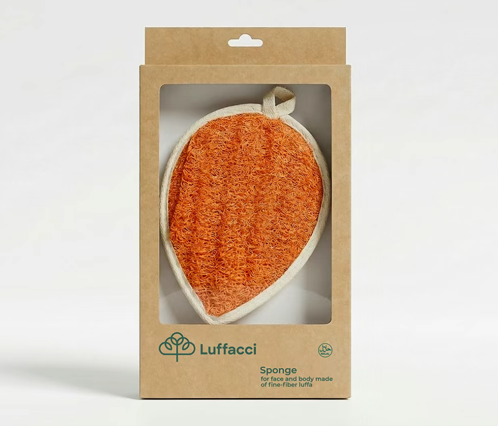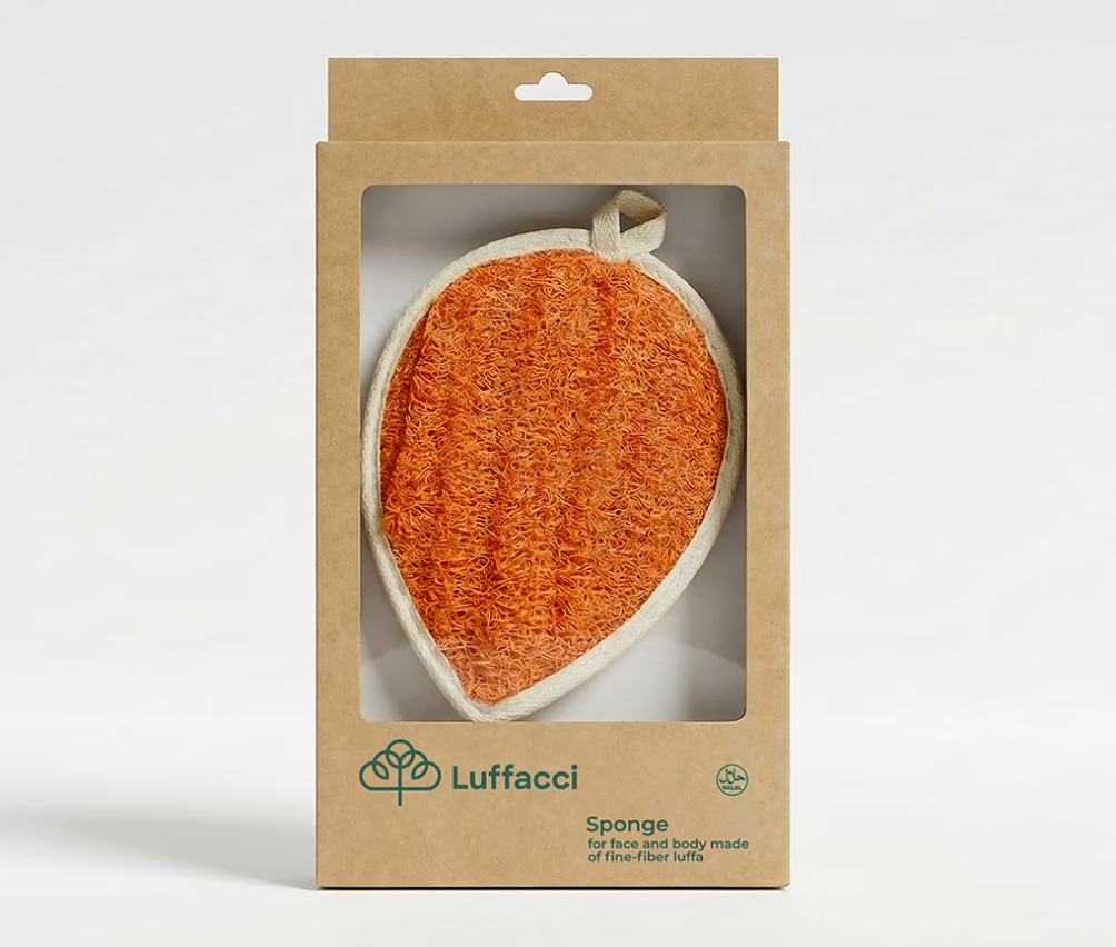 包装采用透明开窗设计,完整露出丝瓜络清洁巾的天然纤维肌理与色彩,让消费者直观感受到细纤维丝瓜络的原生质感,传递天然未经加工的产品特质。 清洁巾本身被设计成叶片 / 果实形态(如柠檬形、苹果形),既呼应丝瓜络的植物本源,又让产品在开窗中呈现出自然美感,强化植物护肤的品牌认知。